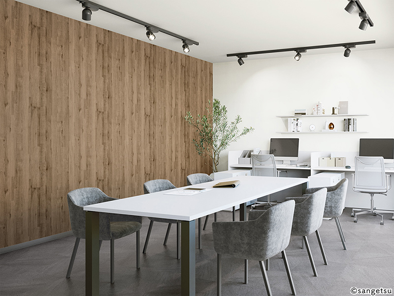 木の質感や風合いをリアルに再現した木目調クロスは、オフィスに自然な温かみを取り入れたいときに選ばれる壁紙です。重厚感のあるダーク調から、ナチュラルで明るいトーンまで幅広く揃っており、空間の雰囲気を変えることができます。