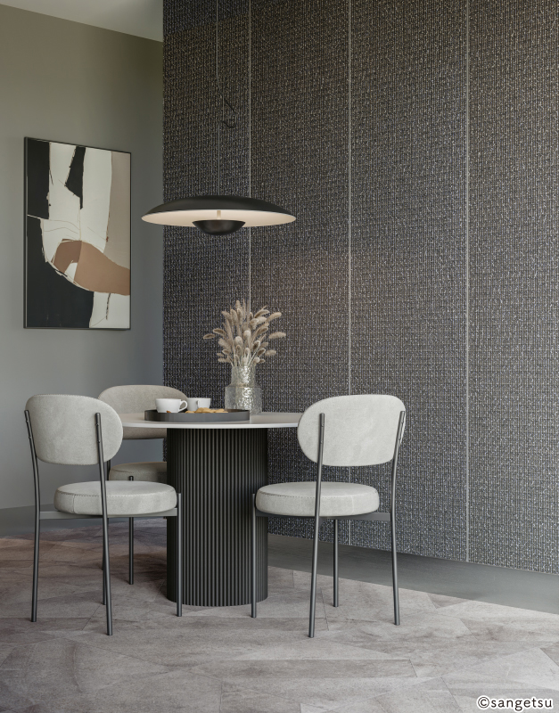 布クロスは、レーヨンや絹、麻などの繊維を用いた壁紙で、上質さや高級感を演出するのに適しています。糸の織り方による凹凸や立体感が特徴で、照明の当たり方によって豊かな表情を楽しめます。さらに通気性や吸湿性に優れており、木製家具とも好相性です。